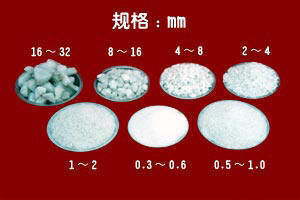 其粒徑從1mm至15mm;分成:1-2.5mm,2-4mm,3-5mm,4-6mm,5-8mm,7-9mm,10-13mm,13-15mm八個規(guī)格。