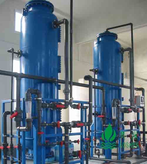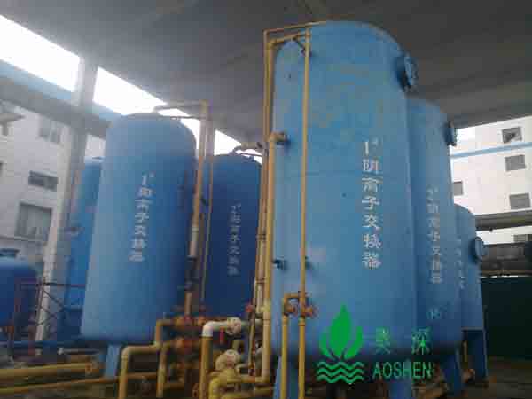 離子交換法是以圓球形樹脂(離子交換樹脂)過濾原水,水中的離子會與固定在樹脂上的離子交換。常見的兩種離子交換方法分別是硬水軟化和去離子法。硬水軟化主要是用在反滲透(RO)處理之前,先將水質硬度降低的一種前處理程序。軟化水設備里面的球狀樹脂,采用特定的陽離子交換樹脂,以鈉離子將水中的鈣鎂離子置換出來,由于鈉鹽的溶解度很高,所以就避免了隨溫度的升高而造成水垢生成的情況。這種方法是目前最常用的標準方式。主要優點是:效果穩定準確,工藝成熟。可以將硬度降至0。采用這種方式的軟化水設備一般也叫做“離子交換器”。 離子交換樹脂是一種聚合物,一種多孔的、不可溶性交換材料,帶有相應的功能基團。利用氫離子交換陽離子,而以氫氧根離子交換陰離子;以包含磺酸根的苯乙烯和二乙烯苯制成的陽離子交換樹脂會以氫離子交換碰到的各種陽離子(例如Na+、Ca2+、Al3+)。同樣的,以包含季銨鹽的苯乙烯制成的陰離子交換樹脂會以氫氧根離子交換碰到的各種陰離子(如Cl-)。從陽離子交換樹脂釋出的氫離子與從陰離子交換樹脂釋出的氫氧根離子相結合后生成純水。
