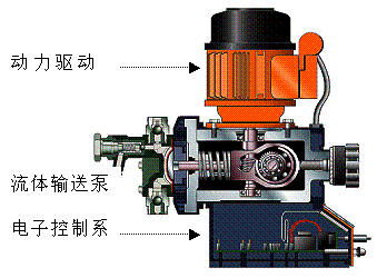 計(jì)量泵主要由動(dòng)力驅(qū)動(dòng)、流體輸送和調(diào)節(jié)控制三部分組成。如圖所示。