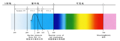 紫外線通指是波長在100-400nm的電磁波,人的眼睛不能看到紫外線。100-400nm波長的紫外線,按其對人體的影響及功能,UV-A,UV-B,UV-C和V-UV。 UV-A是指波長在315-400nm的紫外線,UV-A能使人的皮膚產生黑色素,使皮膚變黑。 UV-B是在波長在280-315nm的紫外線,UV-B能致癌,令皮膚起皺紋老化。 UV-C的波長在200-280nm,其中有254nm波段有殺菌、消毒效能。 波長在240-270nm的UV-C能直接破壞細胞、病毒的DNA(脫氧核糖核酸)和RNA(核糖核酸),使微生物迅速死亡。 波長在100-200nm的V-UV185nm能產生臭氧,而在空氣中或溶解在水中的臭氧,能把微生物的細胞壁以氧化作用破壞,使微生物立刻死亡。
