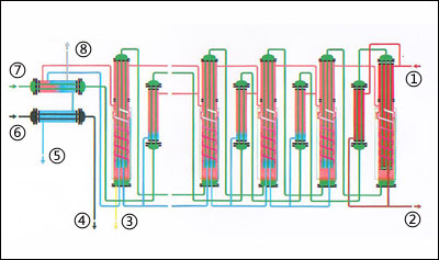 原料水轉化成的二次蒸汽是潔凈蒸汽,它經過三次分離作用:在最初進入蒸發器后,沿列管向下流動,同時蒸發,這是第一次分離;被蒸發的原料水(二次蒸汽)在蒸發器的下端180度折返,雜質在重力作用下,被分離到下部,這是第二次分離;被蒸發的原料水,即二次蒸汽,繼續在蒸發器中盤旋上升,到中上部特殊分離裝置處,進行第三次分離。冷卻水只在冷凝器通過,對各效產生的蒸餾水和末效的二次蒸汽進行降溫。工業蒸汽在第一效的蒸發器和預熱器對原料水進行加熱,熱量被吸收后成為凝結水排出機外。在冷凝器中,有一種不能凝結成水的一部分氣體,被稱作不凝性氣體,此部分氣體將由安裝在冷凝器上部的排出裝置去除。根據機型的不同,在各效蒸發器上也可能設有不凝氣體連續排放裝置。