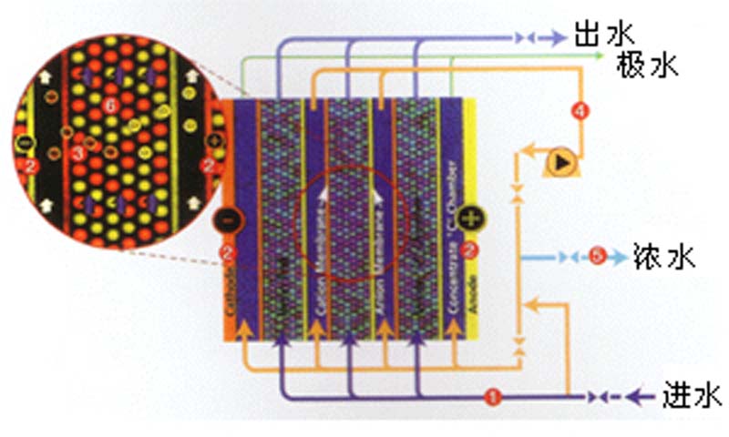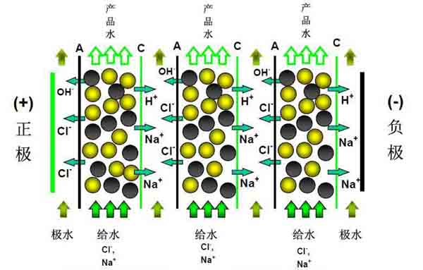 EDI技術(shù)簡介 (Electrodeionization)又稱連續(xù)電除鹽技術(shù),它科學地將電滲析技術(shù)和離子交換技術(shù)融為一體,通過陽、陰離子膜對陽、陰離子的選擇透過作用以及離子交換樹脂對水中離子的交換作用,在電場的作用下實現(xiàn)水中離子的定向遷移,從而達到水的深度凈化除鹽,并通過水電解產(chǎn)生的氫離子和氫氧根離子對裝填樹脂進行連續(xù)再生,因此EDI制水過程不需酸、堿化學藥品再生即可連續(xù)制取高品質(zhì)超純水,它具有技術(shù)先進、結(jié)構(gòu)緊湊、操作簡便的優(yōu)點,可廣泛應(yīng)用于電力、電子、醫(yī)藥、化工、食品和實驗室領(lǐng)域,是水處理技術(shù)的綠色革命。這一新技術(shù)可以代替?zhèn)鹘y(tǒng)的離子交換裝置,生產(chǎn)出電阻率高達16-18MΩ·CM的超純水。