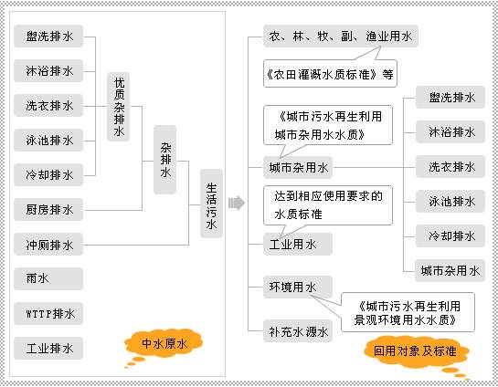1.1、中水水源 中水水源包括:冷卻排水、淋浴排水、盥洗排水、廚房排水、廁所排水、城市污水廠二沉池出水和工業污水作為中水水源等。嚴禁傳染病醫院、結核病醫院污水和放射性污水作為中水水源。對于住宅建筑可考慮除廁所生活污水外其余排水作為中水水源;對于大型的公共建筑、旅館、商住樓等,采用冷卻排水、淋浴排水、盥洗排水作為中水水源;公共食堂、餐廳的排水水質污染程度較高,處理比較復雜,不宜采用;大型洗衣房的排水由于含有各種不同的洗滌劑,能否作為中水源須經試驗確定。