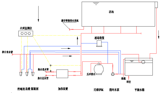 游泳池水首先通過毛發聚集器截留毛發和纖維狀雜物,然后經過水泵加壓進入過濾器去除水中虛浮物和水中膠體使水凈化,再進入換熱器,對水進行加熱,以保持游泳池水溫,最后通過消毒后再注入游泳池,完成游泳池水的循環、再利用過程。