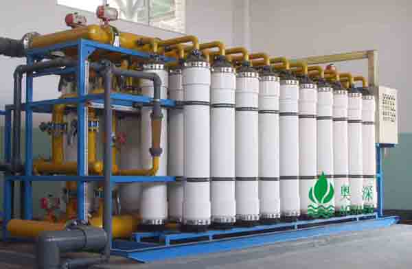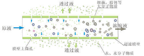 超濾是一種不對稱半透過薄膜,常用材料有醋酸纖維素膜(CA)、聚砜膜(PS)、聚丙烯膜(PAN)等。在一定的壓力下,水在膜表面上流動,水與溶解鹽和其它電解質(zhì)等微小顆粒能透過超濾膜,而蛋白質(zhì)、各類酶、細(xì)菌、病毒、乳膠、熱源與其它分子量大的顆粒和膠體物質(zhì)被超濾膜阻擋,從而使水中的部分微粒得到分離、濃縮。超濾膜孔徑為 0.1-0.002µm ,介于反滲透與微孔膜之間。 超濾裝置是根據(jù)生產(chǎn)的要求,采用相應(yīng)截留分子量的超濾膜進(jìn)行工藝流程設(shè)計。超濾分離在常溫、低壓下運行無相態(tài)變化,膜不易阻塞,操作極為方便。
