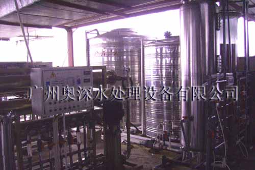 ●源水(箱)→源水泵→機械過濾器→活性炭過濾器→軟水器(根據水的硬度來選用)→精密過濾器→高壓泵→反滲透裝置→中間水箱→陰陽離子混合床→微孔過濾器→用水點